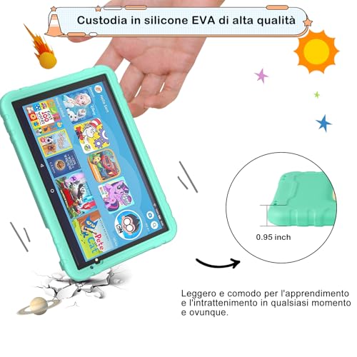 Appena tolto dalla scatola, il tablet JUEDUR per bambini si presenta subito per quello che è: un dispositivo pensato per resistere alle piccole grandi sfide quotidiane. La prima cosa che salta all'occhio è la custodia protettiva in EVA, un materiale morbido ma incredibilmente resistente, che avvolge completamente il tablet. Questa cover non è solo antiurto, ma integra anche una pratica staffa girevole a 360°. Questa funzione si rivela geniale nell'uso di tutti i giorni, permettendo ai bambini di appoggiare il tablet su qualsiasi superficie per guardare i cartoni animati o per seguire le videolezioni senza doverlo tenere in mano.