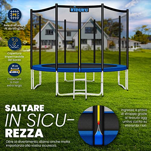 Il trampolino KIDUKU® si presenta come una soluzione "tutto incluso" per chi desidera installare un tappeto elastico in giardino. La confezione contiene, infatti, non solo la struttura e il telo da salto, ma anche una serie di accessori fondamentali per garantire un utilizzo sicuro e duraturo. Troviamo la rete di sicurezza, la scaletta per un facile accesso, una copertura protettiva per quando non è in uso e persino gli ancoraggi per fissarlo saldamente al terreno. Questa completezza è sicuramente un punto a favore, perché evita acquisti separati e garantisce la perfetta compatibilità di ogni componente.