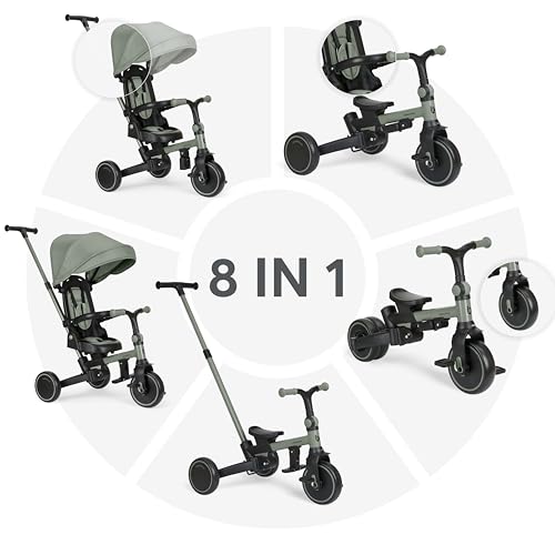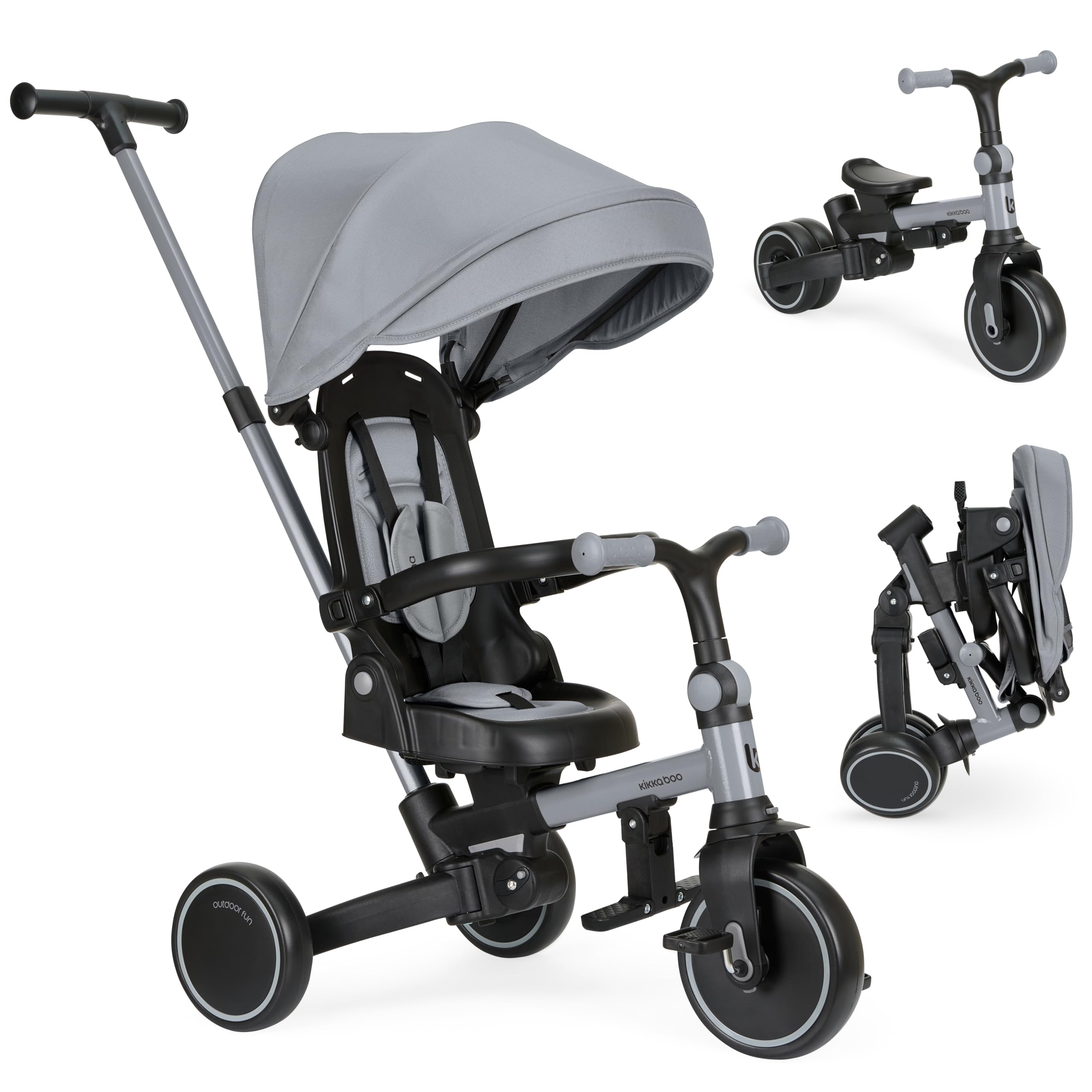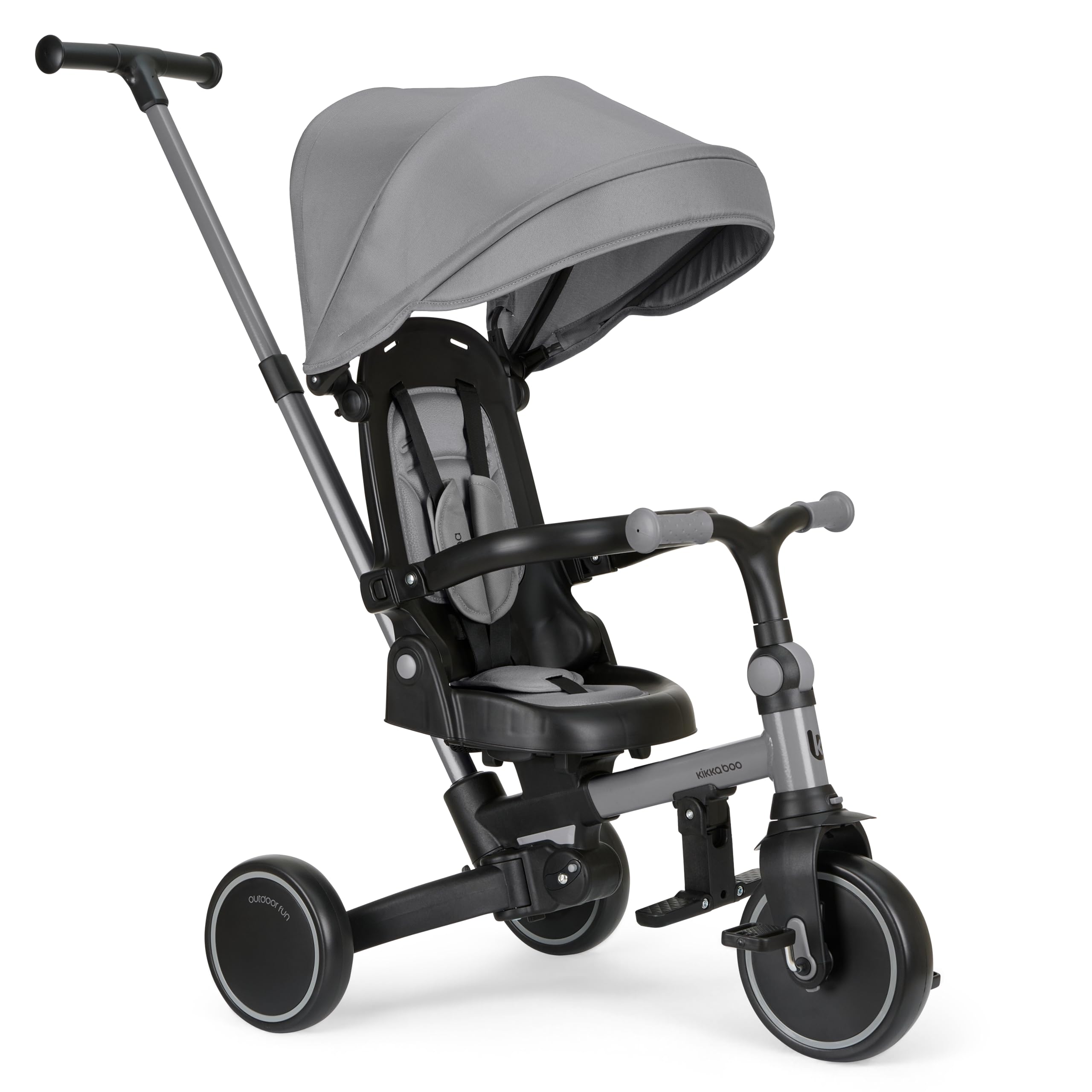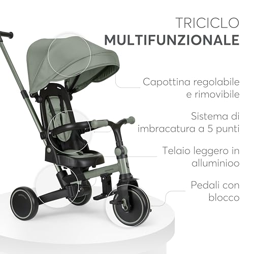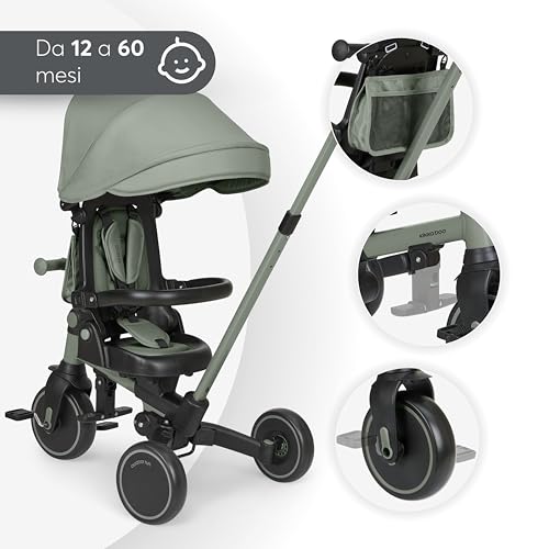 Il concetto alla base del KikkaBoo ALUMA è tanto semplice quanto geniale: offrire ai genitori un prodotto versatile e duraturo, capace di adattarsi alle diverse fasi di crescita del bambino. Si parte dai 12 mesi, quando l'ALUMA funziona come un vero e proprio passeggino, con il genitore che ha il pieno controllo grazie al comodo maniglione direzionale, fino ad arrivare ai 5 anni, quando si trasforma in una bicicletta a tre ruote a tutti gli effetti. Questa trasformazione avviene attraverso 8 diverse modalità, che permettono di rimuovere o modificare gradualmente i vari componenti, come la cappottina, il poggiapiedi, la barra di sicurezza e il maniglione stesso.