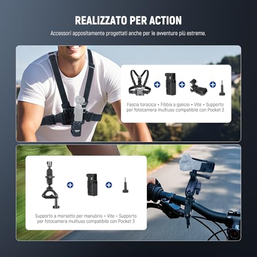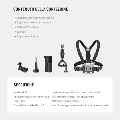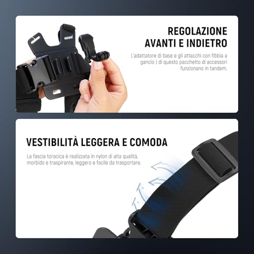 - Imbracatura da petto (Chesty) e fascia da testa: indispensabili per riprese in prima persona (POV) stabili e coinvolgenti durante attività come sci, mountain bike o semplici passeggiate.