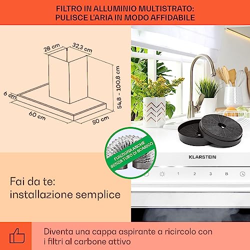 L'installazione di una cappa a incasso richiede una certa manualità, ma le istruzioni fornite da Klarstein sono generalmente chiare. È consigliabile, come per ogni elettrodomestico di questo tipo, affidarsi a un tecnico qualificato per assicurarsi che il montaggio sia eseguito a regola d'arte e in totale sicurezza. All'interno della confezione si trovano solitamente il corpo cappa, il tubo di scarico estensibile e il necessario per il fissaggio.