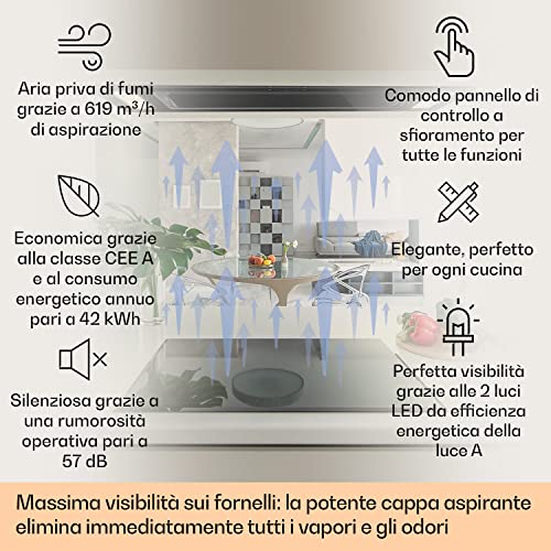La potenza è regolabile su tre diversi livelli, permettendo di adattare l'aspirazione alle reali necessità del momento. Questa caratteristica non solo ottimizza le performance, ma contribuisce anche a un maggior risparmio energetico, come testimoniato dalla sua classe di efficienza energetica A. La gestione delle funzioni è intuitiva e comoda, grazie a un pannello di controllo touch integrato e a un pratico telecomando incluso, che permette di comandare la cappa a distanza senza doversi interrompere.