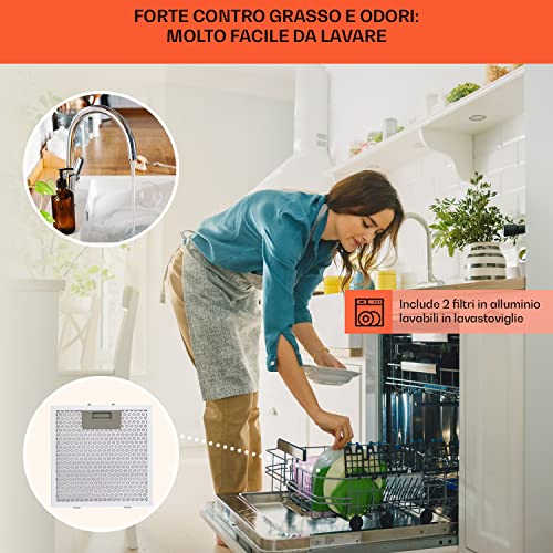 I filtri antigrasso in alluminio, inclusi in dotazione, sono facilmente rimovibili e, soprattutto, lavabili in lavastoviglie. Questo semplifica notevolmente le operazioni di manutenzione, garantendo un'efficienza costante nel tempo e una maggiore igiene.