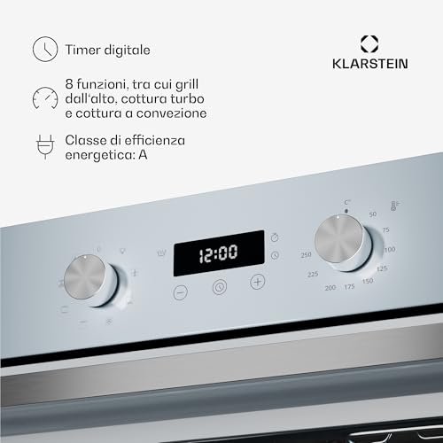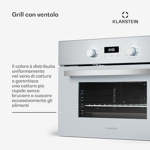 Il vero cuore di un forno sono le sue capacità di cottura e il Klarstein SpaceSmart non delude, offrendo ben 8 funzioni diverse. Oltre alle classiche modalità statica (calore superiore e inferiore) e ventilata, troviamo opzioni più specifiche come il grill, il grill ventilato e una funzione di scongelamento. Questa versatilità lo rende adatto a preparare una vasta gamma di piatti, dalle lasagne della domenica al pollo arrosto, passando per torte e biscotti.