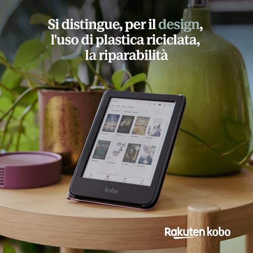 A prima vista, il Kobo Clara Colour potrebbe essere facilmente scambiato per il suo predecessore in bianco e nero, il Kobo Clara 2E. Kobo ha scelto di mantenere un design collaudato e apprezzato, caratterizzato da dimensioni compatte (112 x 160 x 9,2 mm) e un peso piuma di soli 174 grammi. Questa scelta lo rende estremamente maneggevole e perfetto per essere trasportato ovunque, dalla borsa di tutti i giorni al bagaglio a mano per le vacanze. La scocca è realizzata con oltre l'85% di plastica riciclata, di cui il 10% potenzialmente destinata agli oceani, un dettaglio che sottolinea l'impegno del brand verso la sostenibilità.