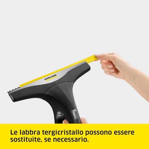 Il Kärcher WV 2 si presenta con il classico design giallo e nero del marchio, sinonimo di robustezza e qualità. È un apparecchio leggero e compatto, con un peso di soli 600 grammi batteria inclusa, che lo rende estremamente maneggevole e poco affaticante anche durante sessioni di pulizia prolungate. L'impugnatura è ergonomica e l'interruttore di accensione, posizionato comodamente, integra un LED che indica lo stato di carica della batteria.