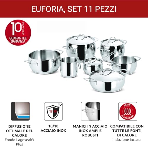 Il set di pentole Lagostina Euforia da 11 pezzi è un prodotto di ottima qualità, solido e performante, che porta in cucina l'affidabilità di un marchio storico. È una scelta eccellente per chi cerca una batteria di pentole in acciaio inox completa, durevole e particolarmente adatta ai piani a induzione, grazie all'efficace fondo Lagoseal Plus. Il design è elegante e la varietà di pezzi la rende versatile per ogni tipo di preparazione. Le piccole pecche, come i manici che si scaldano e la gestione dei coperchi, non ne compromettono il valore complessivo, che rimane molto alto. Consigliata a chi vuole fare un investimento a lungo termine per la propria cucina.