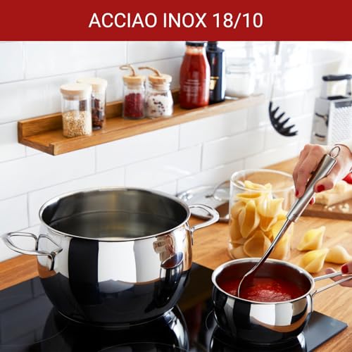 Il set da 11 pezzi è ben assortito e pensato per coprire la maggior parte delle esigenze di una famiglia media. All'interno troviamo: due pentole con coperchio (diametro 18 e 22 cm), due casseruole fonde a due maniglie (18 e 22 cm), una casseruola bassa tipo tegame con coperchio (24 cm), una casseruola a manico lungo con coperchio (14 cm) e un bollilatte (12 cm). Una dotazione completa che permette di passare dalla pasta al risotto, dagli arrosti alle zuppe senza problemi.