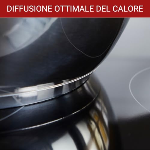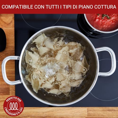 Questa caratteristica si traduce in un minor dispendio di energia e in tempi di cottura leggermente ridotti. Nell'uso pratico, abbiamo notato che l'acqua per la pasta bolle in fretta e che i soffritti rosolano in modo uniforme senza dover continuamente mescolare o spostare la pentola. La compatibilità è totale con tutti i piani cottura, inclusi gas, elettrico e vetroceramica, e le pentole possono essere utilizzate anche in forno fino a 180°C.