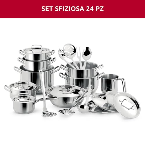 Il set Lagostina Sfiziosa è disponibile in diverse configurazioni, da 10, 13 o addirittura 24 pezzi, per adattarsi a ogni esigenza. La composizione tipica include una varietà di pentole, casseruole di diverse dimensioni (fonde e basse), un tegame e i relativi coperchi in acciaio. Alcune versioni più ricche includono anche utensili da cucina come mestoli, palette e servispaghetti, realizzati con la stessa qualità.