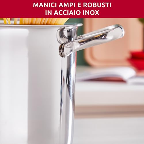 Il design è un altro punto a favore. Le linee sono pulite e moderne, con manicature ampie e saldate che offrono una presa sicura e confortevole durante la cottura e quando si serve in tavola. A differenza di altri modelli con manici in plastica, qui l'acciaio garantisce la possibilità di utilizzare le pentole anche in forno, un vantaggio non indifferente per chi ama preparazioni come arrosti o gratin.