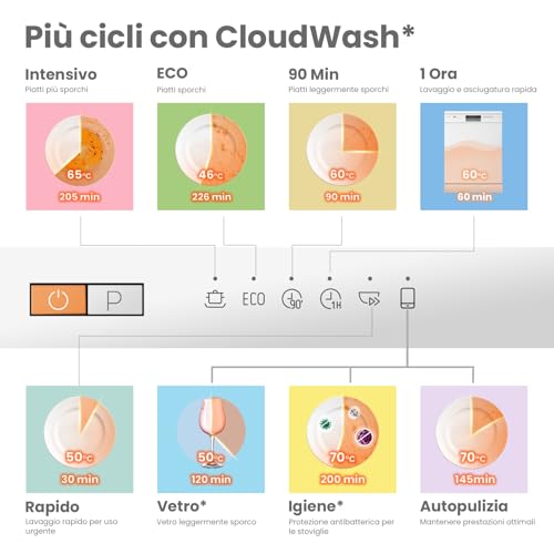 - Intensivo: Ideale per pentole e stoviglie molto sporche, utilizza temperature più alte (fino a 70°C) per garantire una pulizia profonda.