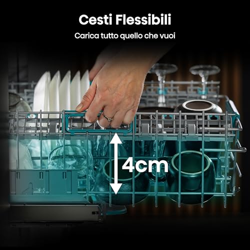 Nell'utilizzo di tutti i giorni, la flessibilità dei cestelli fa la differenza. Entrambi i modelli sono dotati di cestelli regolabili, che permettono di gestire lo spazio interno in modo intelligente. Il modello HV673D64, con i suoi tre cestelli, offre una marcia in più, con un vassoio dedicato alle posate che libera spazio nel cestello inferiore per pentole e piatti più grandi.