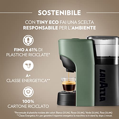 Il secondo aspetto che salta all'occhio è la sua anima "Eco". Lavazza ha realizzato questa macchina utilizzando plastica riciclata, una scelta lodevole che la distingue nel panorama delle macchine da caffè. Questo non compromette affatto la sensazione di solidità: la Tiny Eco appare ben assemblata e robusta. Il design è minimale ma allegro, disponibile in vari colori per aggiungere un tocco di vivacità all'ambiente.