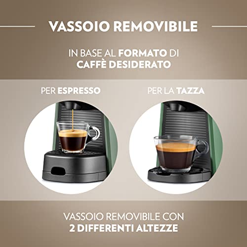 Appena tolta dalla scatola, la Lavazza A Modo Mio Tiny Eco colpisce subito per due motivi: le sue dimensioni incredibilmente compatte e il suo impegno verso la sostenibilità. È una macchina che trova spazio ovunque, perfetta per le cucine più piccole, per l'ufficio o per chi semplicemente non vuole un elettrodomestico ingombrante sul piano di lavoro. Le sue misure sono infatti di appena 13,9 x 26 x 27 cm.