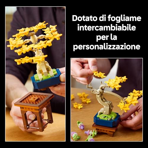 Inoltre, il set incoraggia la creatività: le foglie dei tre alberi sono intercambiabili! Volete vedere come sta il glicine con le foglie gialle del ginkgo? Potete farlo. Questa modularità aggiunge un ulteriore livello di gioco e personalizzazione, permettendovi di creare il vostro bonsai unico.