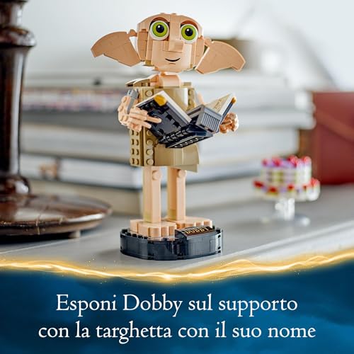 Il design della tunica, volutamente sdrucito e realizzato con mattoncini color dark tan, cattura perfettamente l'essenza del personaggio. Il corpo e la testa sono ben proporzionati, e i grandi occhi verdi donano a Dobby quello sguardo dolce e malinconico che lo ha reso celebre. All'interno del torso si nasconde un piccolo cuore dorato, un dettaglio toccante che simboleggia la grande lealtà dell'elfo.