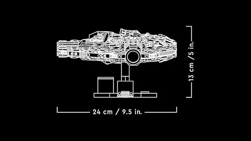 Il set include un elegante supporto da esposizione nero, progettato per mostrare il Falcon in una posa dinamica, inclinato come se fosse in pieno volo. Completano il tutto una targhetta stampata con il nome della nave e un mattoncino speciale per il 25° anniversario di LEGO Star Wars. Questa soluzione espositiva è un enorme passo avanti rispetto al modello del 2009, che ne era sprovvisto.