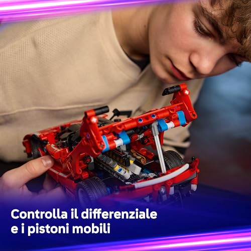 Oltre allo sterzo, il movimento dell'auto fa girare il differenziale posteriore che, a sua volta, anima i pistoni del motore V12, offrendo una simulazione meccanica realistica e affascinante. L'apertura di portiere e cofani aggiunge ulteriore valore alla giocabilità e all'esplorazione del modello una volta completato. Nonostante non abbia sospensioni complesse o un cambio funzionante come i modelli Technic di fascia più alta, le funzioni incluse sono ben implementate e adatte alla scala e alla complessità del set.