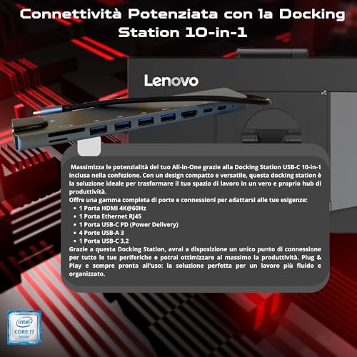 La connettività è completa. Oltre alle porte del Mini PC inserito, il monitor stesso offre porte HDMI e DisplayPort, che consentono di collegare anche altri dispositivi come un laptop. Non mancano diverse porte USB per connettere tutte le periferiche necessarie. In questa specifica versione, è inclusa anche una Doking Station 10 in 1, che espande ulteriormente le possibilità di collegamento con uscite video 4K, porte USB aggiuntive, lettore di schede e porta Ethernet.