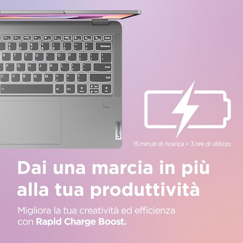 L'autonomia è un altro punto di forza. Grazie alla batteria da 52.5 Wh e all'efficienza del processore AMD, il Flex 5 riesce a garantire un'intera giornata lavorativa con un utilizzo medio. Si possono raggiungere anche 8-9 ore di utilizzo reale tra navigazione e video. Inoltre, con la tecnologia Rapid Charge Boost, è possibile ottenere circa 2 ore di autonomia con soli 15 minuti di ricarica.