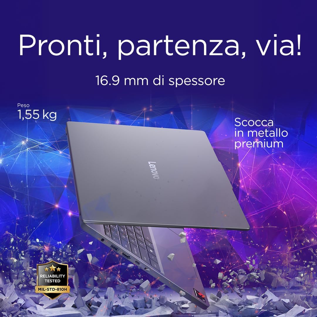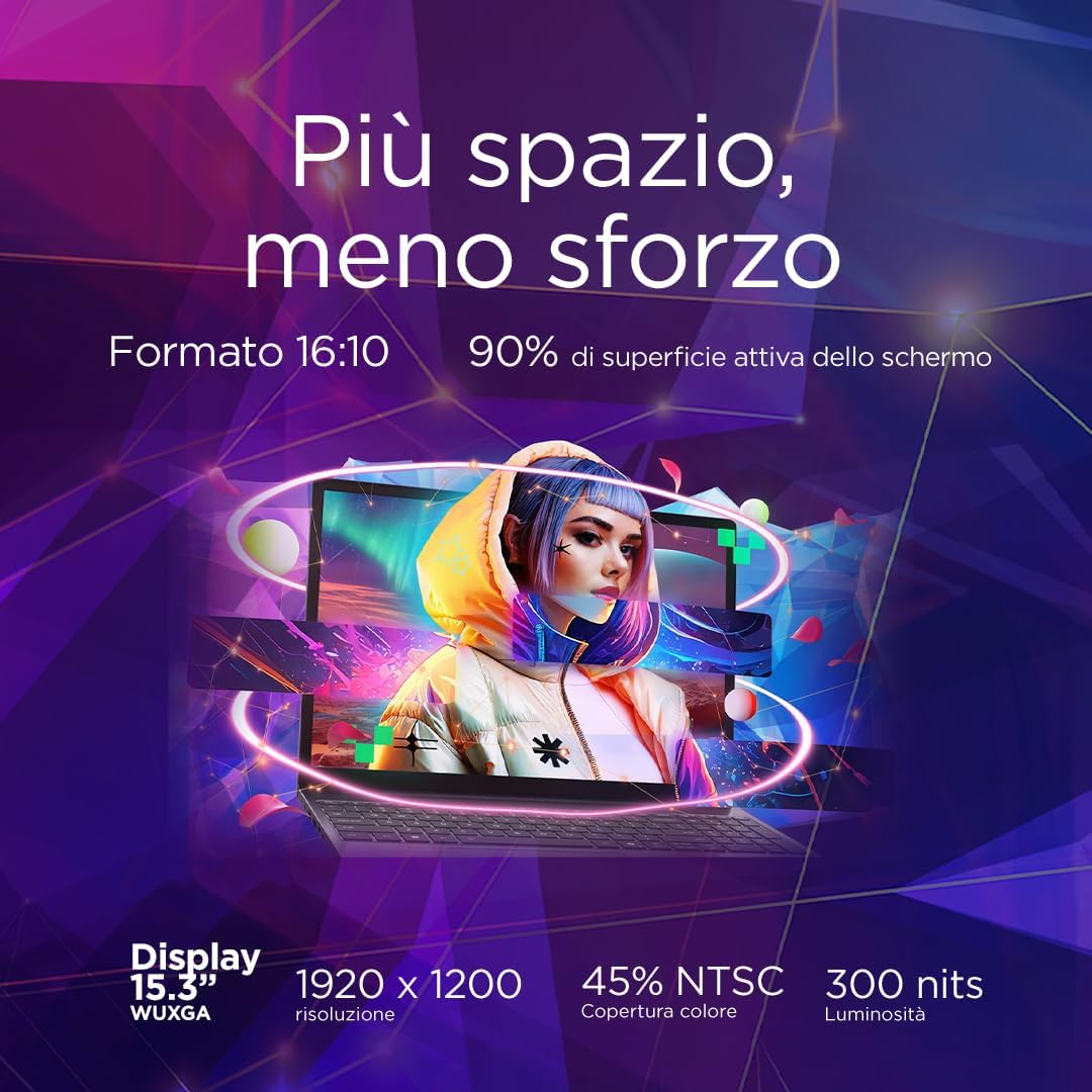 Con un peso che si aggira intorno a 1,6 kg e uno spessore di circa 17,9 mm, questo portatile è decisamente un compagno di viaggio ideale. È facile da infilare in uno zaino o in una borsa senza appesantire troppo, rendendolo perfetto per studenti e pendolari. Un dettaglio apprezzabile è la finitura della superficie, che resiste bene alle impronte digitali, mantenendo il notebook più pulito a lungo.