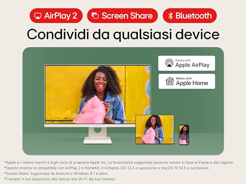Ma le funzionalità smart non finiscono qui. Il monitor supporta AirPlay 2 e Screen Share, permettendo di trasmettere contenuti in modalità wireless da dispositivi Apple e Android con estrema facilità. Questa versatilità lo rende perfetto per chi vive in un ecosistema multi-dispositivo. Inoltre, la funzione Home Office consente di accedere a servizi cloud e al proprio PC da remoto, potenziando la produttività per chi lavora da casa.
