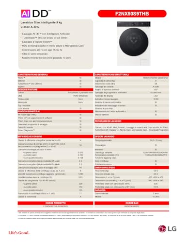 E per gli amanti della domotica? La LG F2NX50S9THB è una lavatrice smart a tutti gli effetti. Grazie alla connettività Wi-Fi e all'app LG ThinQ™, puoi gestire la lavatrice da remoto con il tuo smartphone. Puoi avviare un ciclo, ricevere notifiche quando il bucato è pronto, scaricare nuovi programmi di lavaggio e persino monitorare i consumi energetici, tutto comodamente dal divano o mentre sei fuori casa.