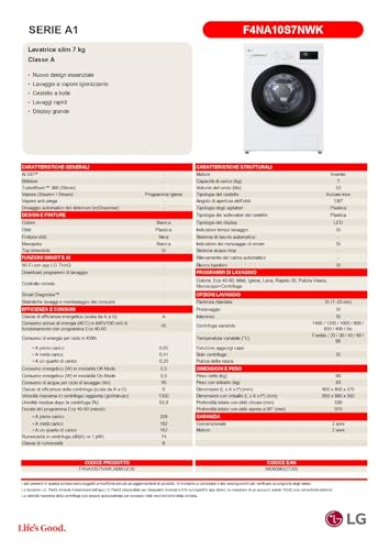 In un periodo in cui i costi dell'energia sono una preoccupazione costante, l'efficienza di un elettrodomestico è un fattore d'acquisto cruciale. La LG F4NA10S7NWK risponde presente con una brillante Classe di Efficienza Energetica A, la più alta secondo le nuove etichette europee. Questo si traduce in consumi ridotti: parliamo di circa 45 kWh per 100 cicli in modalità Eco. Anche il consumo d'acqua è ottimizzato, attestandosi sui 45 litri per un ciclo Eco a pieno carico.