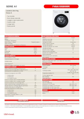 La LG F4NA10S8NWK è una lavatrice slim che mantiene le promesse. È la scelta perfetta per chi ha bisogno di ottimizzare lo spazio senza rinunciare a una buona capacità di carico e a funzionalità moderne come il vapore igienizzante. L'eccellente efficienza energetica e la silenziosità del motore Inverter sono plus indiscutibili. Il design curato la rende anche un bell'oggetto d'arredo. L'unico neo potrebbe essere la limitata scelta di programmi a media durata. Nel complesso, si tratta di un prodotto solido, affidabile e tecnologicamente valido, che offre un ottimo pacchetto di funzionalità in dimensioni compatte.