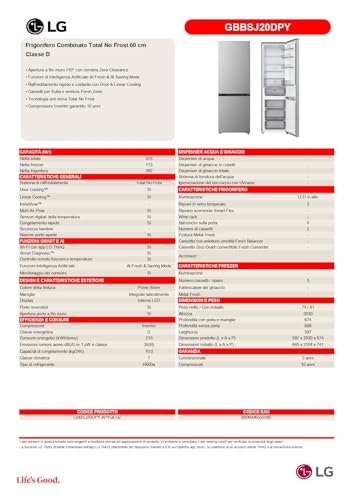 L'LG GBBSJ20DPY è un elettrodomestico intelligente. Grazie alla connettività Wi-Fi e all'app LG ThinQ™, è possibile gestire e monitorare il frigorifero da remoto tramite smartphone. Una delle funzioni più innovative è l'AI Inverter, un sistema di intelligenza artificiale che apprende le abitudini di utilizzo dell'utente (come gli orari in cui si apre più spesso la porta) per ottimizzare il raffreddamento e i consumi energetici. L'AI Saving Mode, gestibile tramite app, permette di regolare ulteriormente i consumi quando necessario.