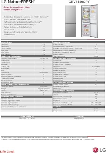 Un altro punto di forza del LG GBV21L0EPY è il suo Compressore Smart Inverter. A differenza dei compressori tradizionali che si accendono e si spengono continuamente, quello Inverter regola la sua velocità in base alla reale necessità di raffreddamento. Questo si traduce in un notevole risparmio energetico (il frigorifero è in classe E, con un consumo annuo di 253 kWh), una maggiore durata nel tempo e una rumorosità molto contenuta. Con un'emissione acustica di soli 35 dB, rientra nella classe di rumore B, rendendolo di fatto molto silenzioso e adatto anche a cucine a vista o monolocali. LG è così sicura dell'affidabilità di questo componente da garantirlo per ben 10 anni.