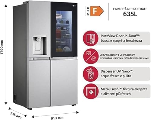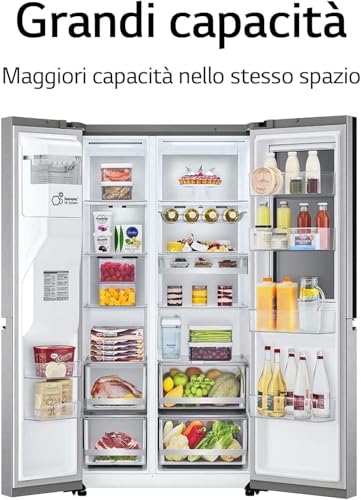 Il primo impatto con l'LG GSXV80PZLE è senza dubbio notevole. Parliamo di un frigorifero Side by Side imponente, con le sue dimensioni generose (91,3 cm di larghezza per 179 cm di altezza) e una finitura in Inox Premium che dona un tocco di eleganza e modernità a qualsiasi cucina. Nonostante la stazza, il design è pulito e minimale, grazie anche alle maniglie integrate orizzontalmente che scompaiono alla vista, mantenendo una linea fluida e continua.