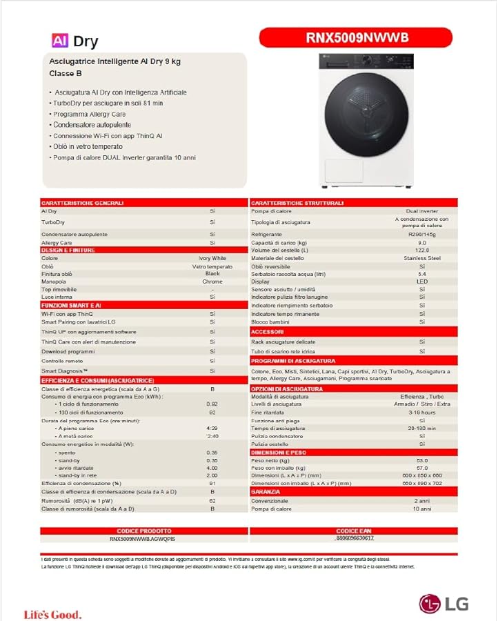 Dopo averla testata a fondo, possiamo dire che la LG RNX5009NWWB AI Dry 9Kg è un'asciugatrice che ci ha convinti. La tecnologia AI Dry non è solo una trovata di marketing, ma una funzione concreta che migliora l'esperienza di utilizzo e si prende cura dei capi. La combinazione di efficienza energetica, silenziosità, un'ampia gamma di programmi e la comodità della gestione smart la rendono un prodotto estremamente valido e completo. Sebbene la classe energetica B possa inizialmente destare qualche perplessità, le tecnologie impiegate garantiscono consumi ottimizzati. È la scelta ideale per chi cerca un'asciugatrice intelligente, performante e che semplifichi la gestione del bucato quotidiano.