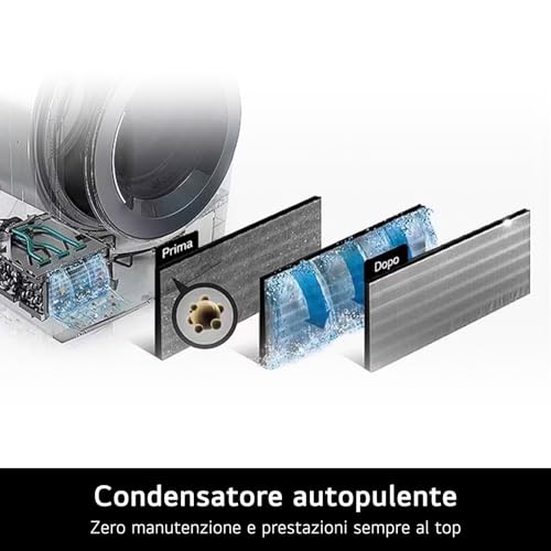 Un altro aspetto degno di nota è il condensatore autopulente. Grazie a potenti getti d'acqua, il condensatore viene mantenuto pulito ed efficiente nel tempo, garantendo prestazioni costanti e liberandoci dalla noiosa manutenzione manuale. Questa caratteristica, unita al sistema DUAL Inverter, contribuisce a mantenere alta l'efficienza dell'elettrodomestico nel lungo periodo.