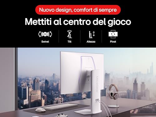 Le cornici sottilissime su tre lati massimizzano l'area di visualizzazione e lo rendono perfetto per configurazioni multi-monitor. La base a V, solida e ben progettata, offre un'ottima stabilità e ampie possibilità di regolazione ergonomica: puoi inclinarlo, regolarlo in altezza, ruotarlo (pivot) e girarlo (swivel) per trovare la posizione perfetta per le tue lunghe sessioni di gioco.