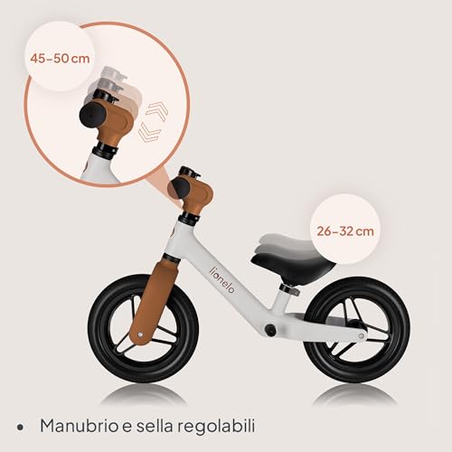 Un grande vantaggio della lionelo TONI è la sua capacità di "crescere" insieme al bambino. Sia la sella che il manubrio sono regolabili in altezza. La sella può essere regolata da 26 a 32 cm da terra, mentre il manubrio da 45 a 50 cm. Questo permette di adattare perfettamente la bicicletta alla statura del bambino, garantendo sempre una postura corretta e confortevole. Grazie a queste regolazioni, la TONI può essere utilizzata per un lungo periodo, rappresentando un investimento duraturo.