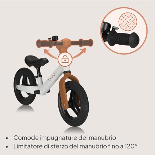 La lionelo TONI non è solo leggera, ma anche ben pensata dal punto di vista della sicurezza e dell'ergonomia. Un elemento fondamentale per la sicurezza dei piccoli ciclisti è il limitatore di sterzata a 120°. Questo meccanismo impedisce al manubrio di ruotare completamente, evitando così le sterzate troppo brusche che potrebbero causare cadute e ribaltamenti. È una caratteristica rassicurante per i genitori, soprattutto nelle prime fasi di apprendimento.