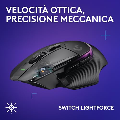 - Tecnologia wireless LIGHTSPEED: Utilizzando il dongle USB incluso, si ottiene una connessione a 2.4 GHz ultra-veloce (1ms di report rate), stabile e affidabile, ideale per il gaming competitivo. Un'ottima funzione è la possibilità di collegare fino a due dispositivi LIGHTSPEED (ad esempio, tastiera e mouse) allo stesso ricevitore, liberando una porta USB sul PC.