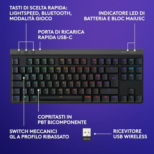 - Bluetooth: Perfetta per connettere la tastiera a laptop, tablet o altri dispositivi senza occupare porte USB. La connessione è stabile, anche se presenta una latenza leggermente superiore rispetto alla LIGHTSPEED, rendendola più adatta alla produttività che al gaming puro.
