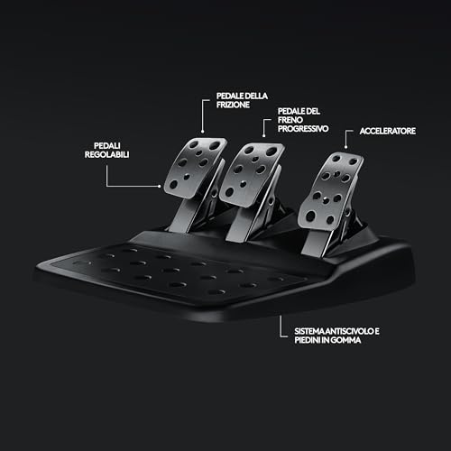 La pedaliera, inclusa nella confezione, non è da meno. Con una struttura robusta e pedali in metallo (acceleratore, freno e frizione), offre un feeling realistico e decisamente superiore a quello di molti concorrenti nella stessa fascia di mercato. L'installazione è semplice e intuitiva: basta collegare i cavi e il sistema è pronto all'uso sia su Xbox (Series X|S e One) che su PC, grazie al supporto completo del software Logitech G HUB.