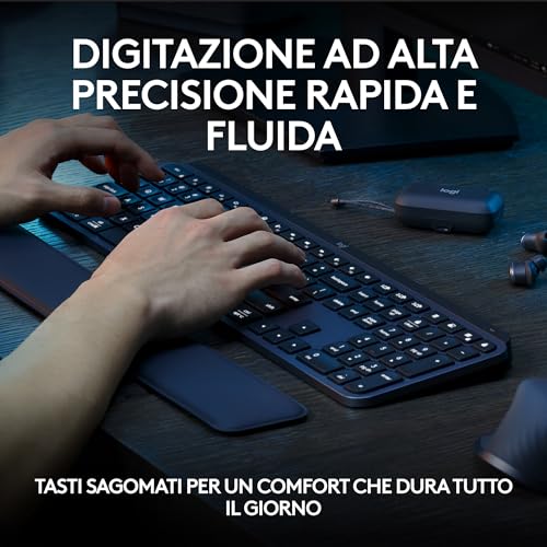 Il cuore di ogni tastiera è l'esperienza di scrittura, e qui la MX Keys S eccelle. I tasti, basati su un meccanismo a forbice, sono a basso profilo, simili a quelli di un laptop di alta gamma. La loro particolarità è la forma concava, sferica, che accoglie perfettamente i polpastrelli, aumentando il comfort e riducendo drasticamente gli errori di battitura. La corsa dei tasti è breve ma precisa, con un feedback tattile molto piacevole che rende la digitazione veloce e fluida.