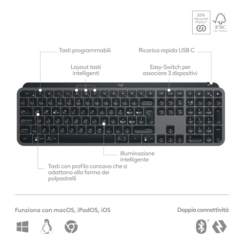 La versatilità è un altro punto di forza. La MX Keys S può essere collegata a tre dispositivi contemporaneamente, passando dall'uno all'altro con la semplice pressione dei tasti Easy-Switch. La connessione avviene tramite Bluetooth Low Energy o, per una maggiore stabilità e sicurezza, tramite il ricevitore USB Logi Bolt incluso. È compatibile con praticamente tutti i sistemi operativi: Windows, macOS, Linux, ChromeOS, iPadOS e Android.