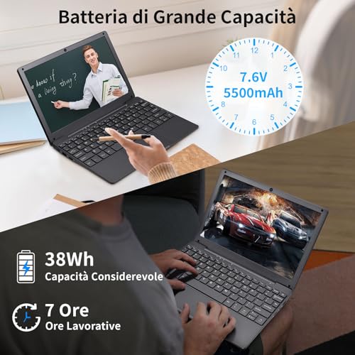 Il cuore pulsante di questo mini laptop è il processore Intel Celeron N4020, un dual-core con una frequenza che può arrivare fino a 2.8 GHz. Si tratta di una CPU entry-level, progettata per il risparmio energetico e per gestire compiti non troppo impegnativi. Ad affiancarlo troviamo 8 GB di RAM DDR4, una quantità più che sufficiente per garantire un'esperienza fluida nel multitasking leggero, come tenere aperte diverse schede del browser, un editor di testo e un client di posta elettronica contemporaneamente.