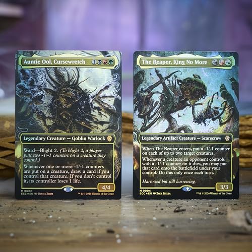 Ogni mazzo Commander di questa uscita include 12 carte inedite, di cui 2 rare mitiche foil. In "Maledizione della Piaga", queste nuove aggiunte sono pensate per potenziare ulteriormente la strategia dei contatori. Ci aspettiamo di trovare creature che beneficiano della morte di creature avversarie con contatori, istantanei e stregonerie che distribuiscono questi segnalini in massa e magari qualche artefatto o incantesimo che funge da motore sinergico per l'intera strategia.