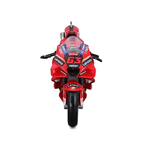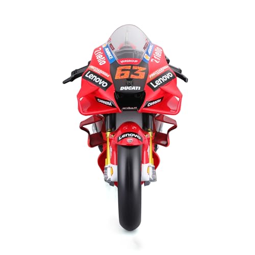 Appena tolto dalla scatola, il modello Maisto della Ducati Desmosedici GP 2022 di Francesco Bagnaia colpisce per le sue dimensioni. Parliamo di una scala 1/6, che si traduce in una lunghezza di circa 34-40 cm, un pezzo decisamente importante che si fa notare. Il primo impatto visivo è davvero notevole: la livrea rossa fiammante della Ducati è riprodotta con cura, e gli adesivi degli sponsor sono applicati con precisione, restituendo un colpo d'occhio fedele alla moto originale che ha trionfato nel campionato MotoGP 2022.