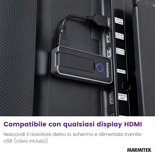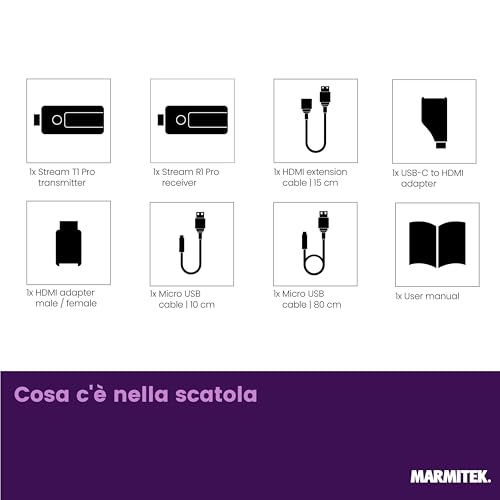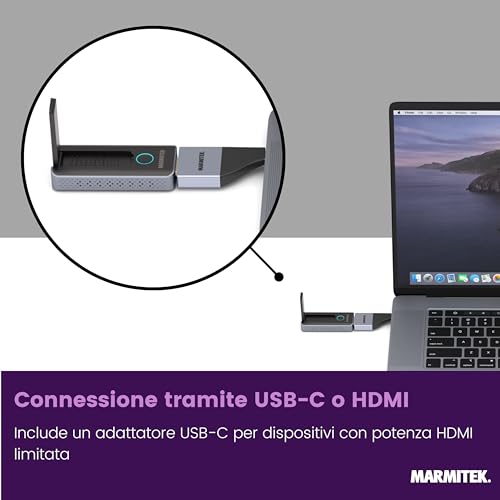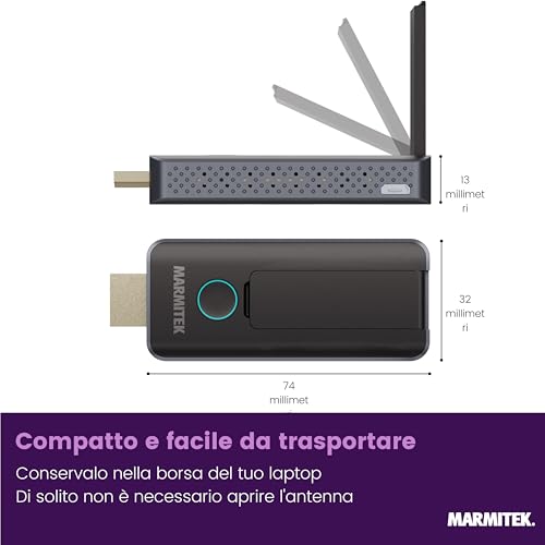Il Marmitek Stream S1 Pro è la definizione di plug-and-play. È progettato per un singolo scopo: creare una connessione wireless punto-punto tra un laptop e uno schermo. Il kit è composto da un trasmettitore (Stream T1 Pro) e un ricevitore (Stream R1 Pro) praticamente identici nell'aspetto. L'installazione è a prova di errore: si collega il ricevitore alla porta HDMI dello schermo (alimentandolo tramite una porta USB dello stesso) e il trasmettitore alla porta HDMI del portatile. Geniale l'inclusione di un adattatore da HDMI a USB-C, che lo rende immediatamente compatibile con MacBook e Chromebook moderni senza bisogno di accessori extra.