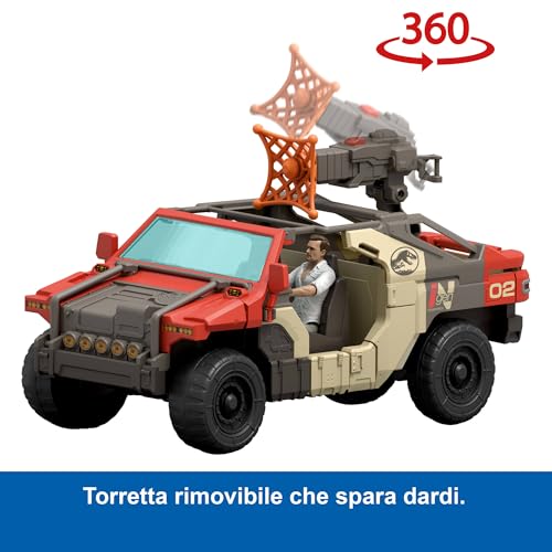 La caratteristica principale, però, è la torretta lanciaproiettili rimovibile. Questa può essere montata sul retro del camion e offre due modalità di "cattura": un dardo per immobilizzare il dinosauro a distanza e una rete per intrappolarlo. Il meccanismo di lancio è semplice da usare anche per i più piccoli ma efficace, aggiungendo un elemento di interattività e strategia al gioco. La torretta può ruotare e inclinarsi, permettendo di prendere la mira con precisione.
