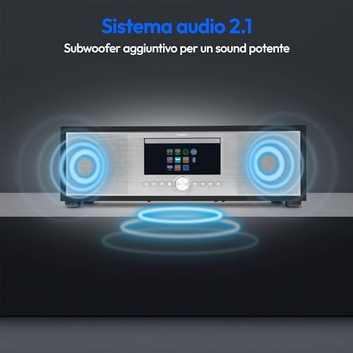 Il concetto alla base del MEDION 2.1 Sistema audio tutto in uno con subwoofer è tanto semplice quanto ambizioso: offrire un accesso completo a qualsiasi fonte musicale, vecchia e nuova, in un unico prodotto dal design compatto e moderno. Dimentica l'accumulo di dispositivi diversi; qui hai a disposizione radio Internet, DAB+, radio FM, lettore CD/MP3, Spotify Connect, Amazon Music, Bluetooth, USB e ingresso AUX. È letteralmente un hub musicale che accontenta tutti, dal nostalgico amante dei CD al giovane streamer compulsivo.