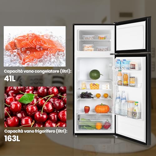 Nonostante le dimensioni esterne contenute, l'interno del Midea MERT210FGE è studiato per massimizzare lo spazio disponibile. I 204 litri totali sono suddivisi in 163 litri per il vano frigorifero e 41 litri per il vano congelatore posizionato in alto. Questa configurazione "top mount" è classica e molto pratica per chi utilizza più frequentemente il frigo rispetto al freezer.